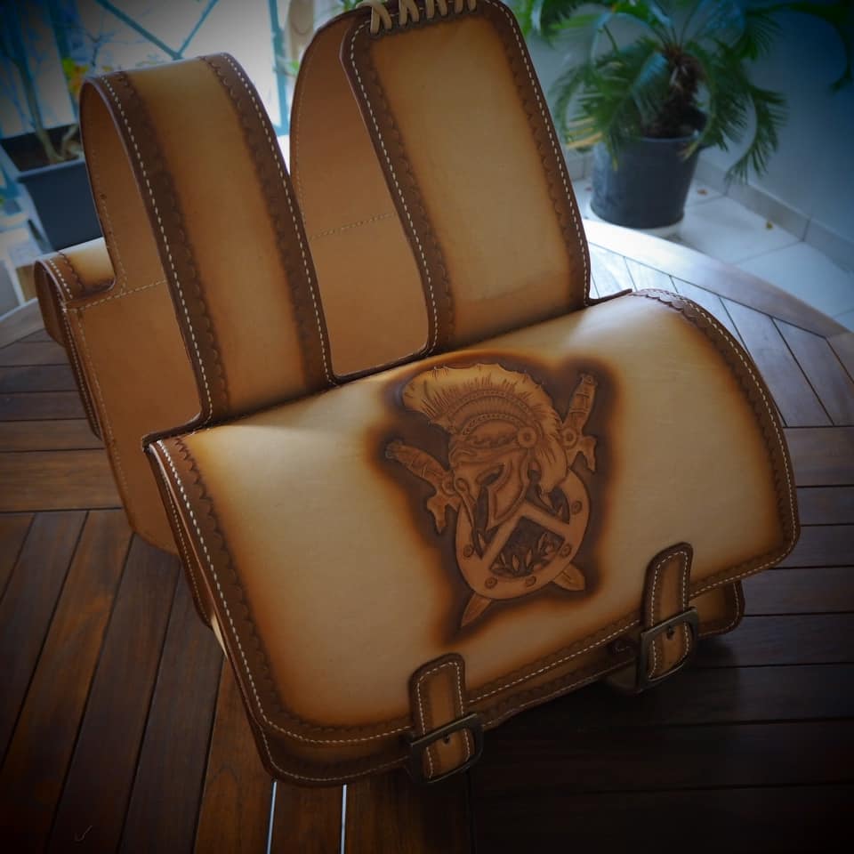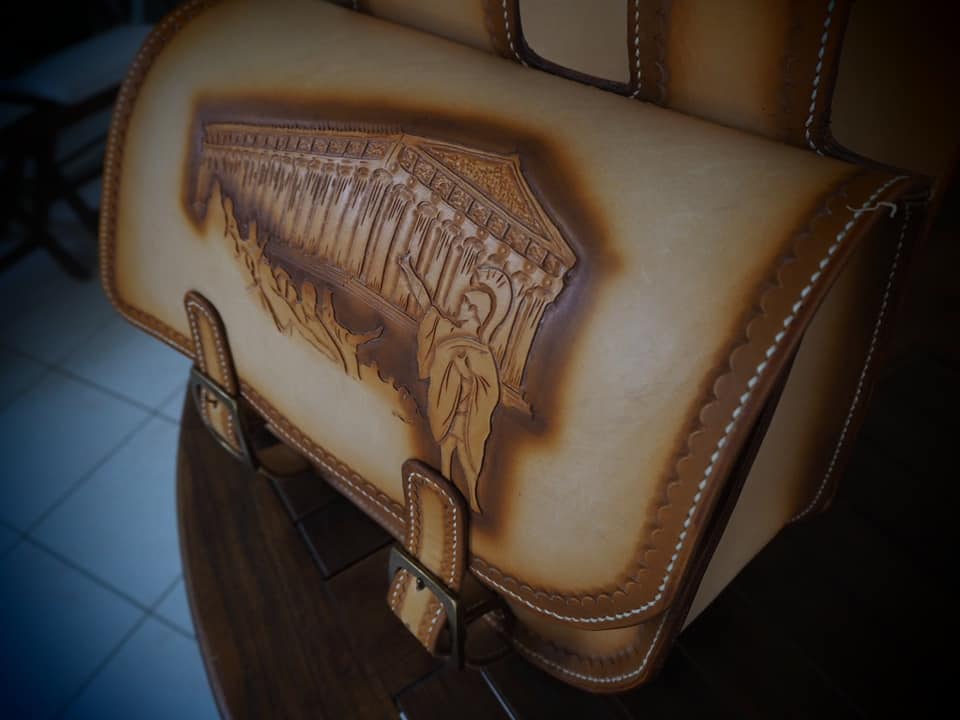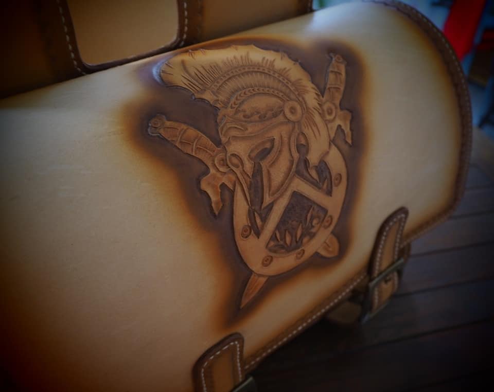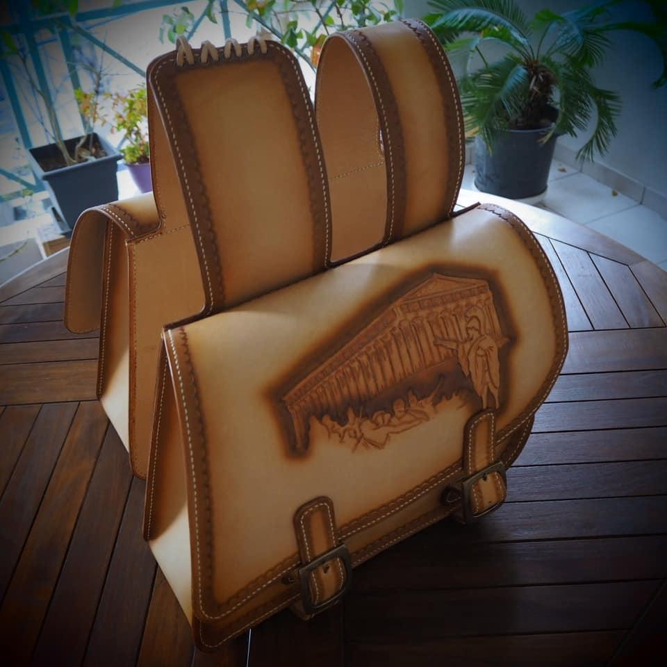 Δερμάτινη χειροποίητη σκαλιστή Τσάντα Μοτοσυκλέτας (Ancient Greece), κατασκευασμένη όλη στο χέρι.